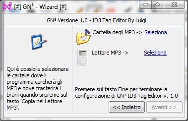 GN³ was a mIRC script, but the main mIRC window was completely hidden upon starting, and just my custom dialogs opened when launching the application. On first execution, a wizard allowed the user to choose the folder of the music library on the pc and select the MP3 player drive letter. In addition to editing ID3 tags, it was also possible to sync the music folder contents with the MP3 flash memory.