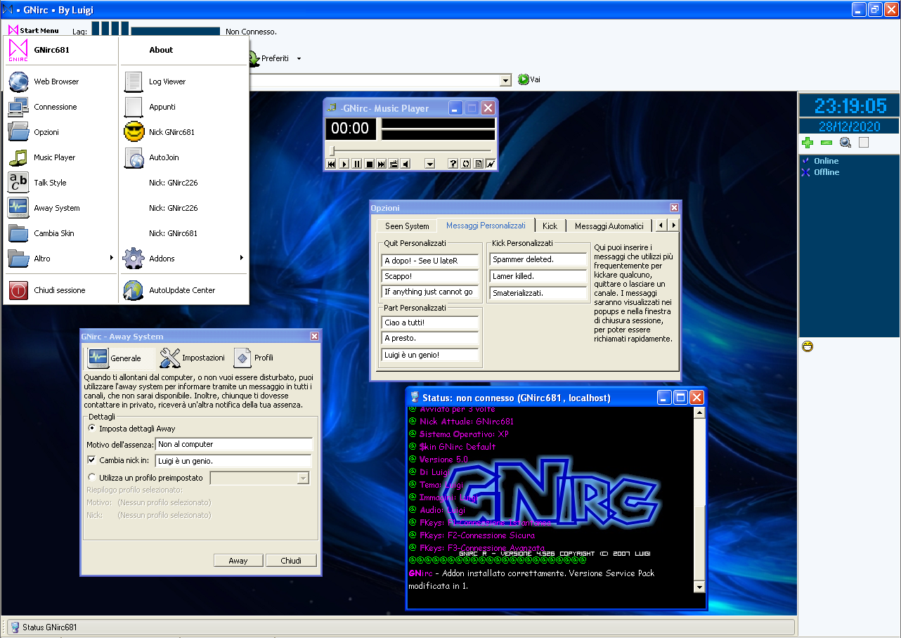 Since its development lasted about 3 years, there are portions of it that were written early on and that required some additional work by the end of its life. Some of them were rewritten towards the late GNirc years and were released as an update, thanks to the self-update mechanism that was built-in to the script. These rewritten portions include the music player, that supported instant search inside the MP3 folder (a feature that was not even yet part of Windows back then!) the new nick list and improved away system. Additionally, GNirc supported a theme system that allowed to change the window colors, backgrounds, text colors and sound effects, but since I never bothered to write any documentation for it, just a couple of themes were ever released.